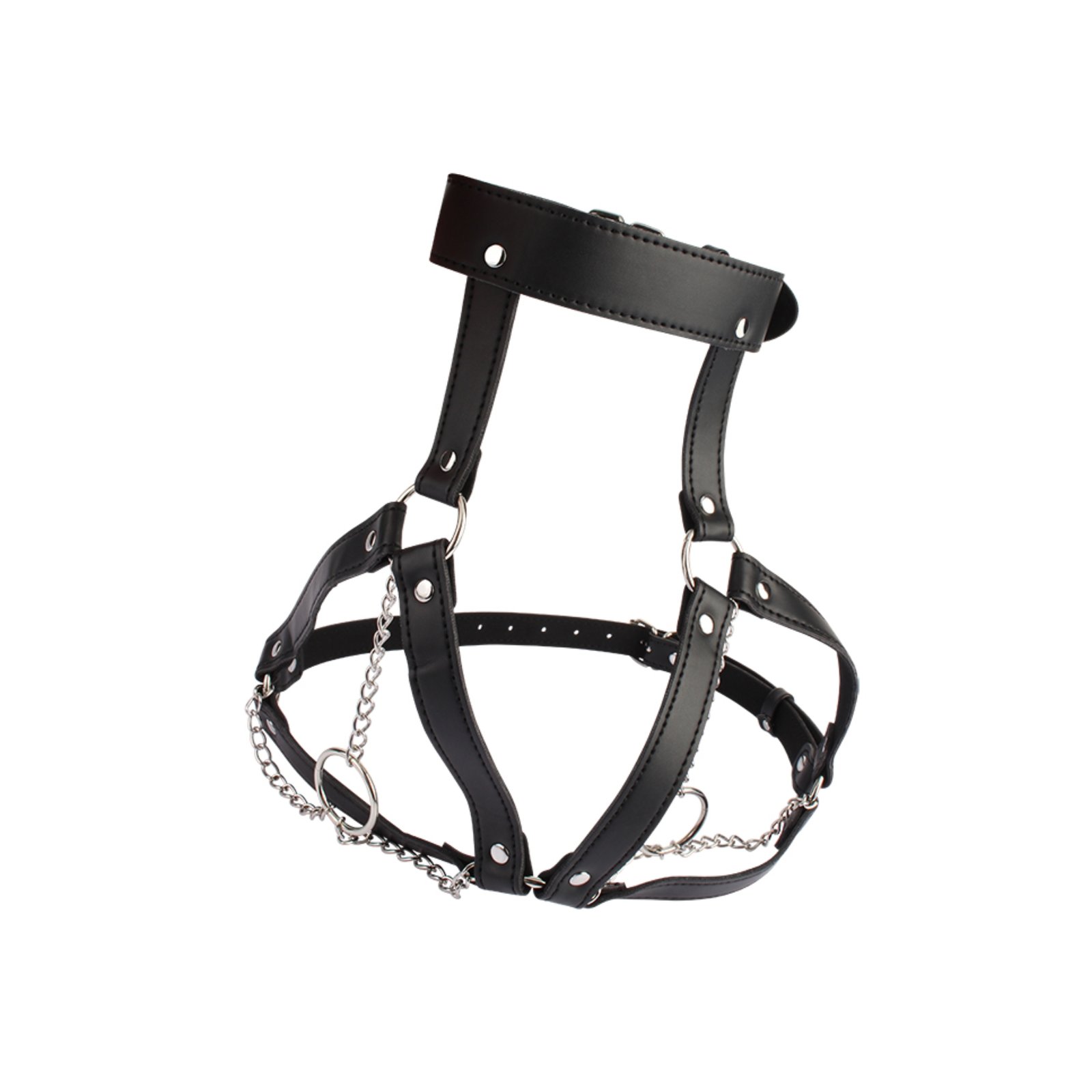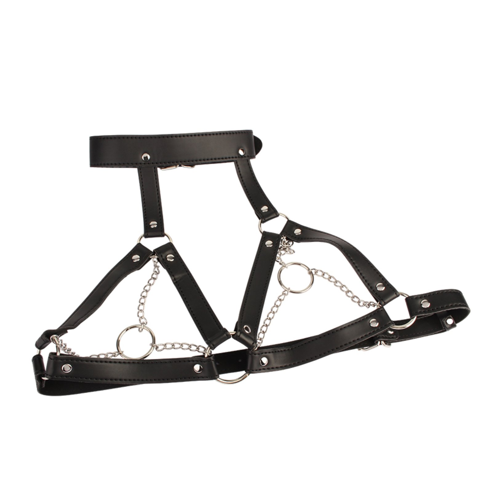 Los anillos metálicos permiten integrar accesorios adicionales si se desea, mientras que las cadenas generan una sensación envolvente y visualmente poderosa. Ideal para sesiones de bondage más avanzadas donde la estética y el control son protagonistas.