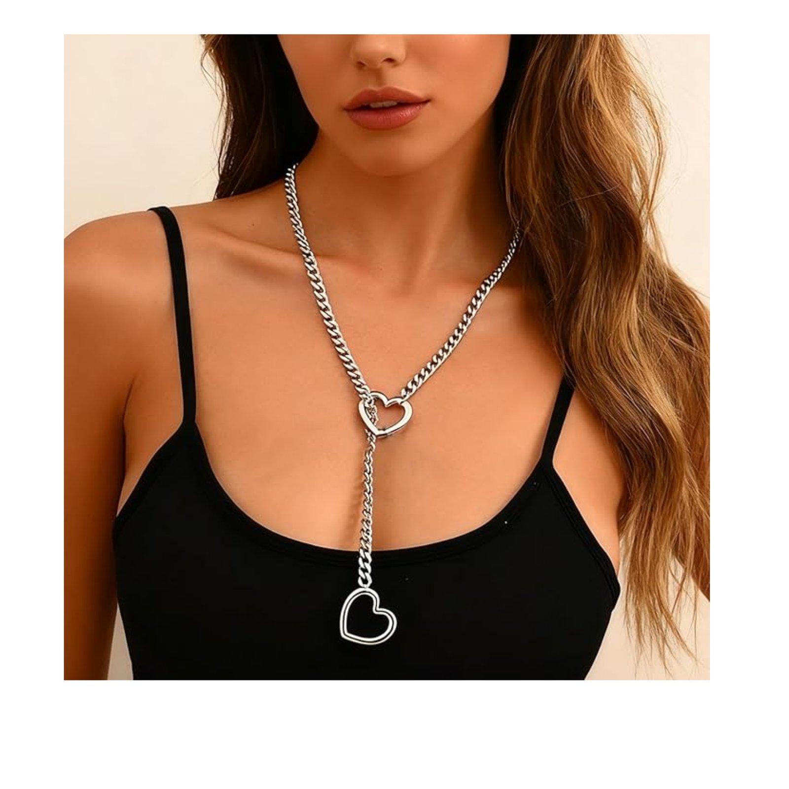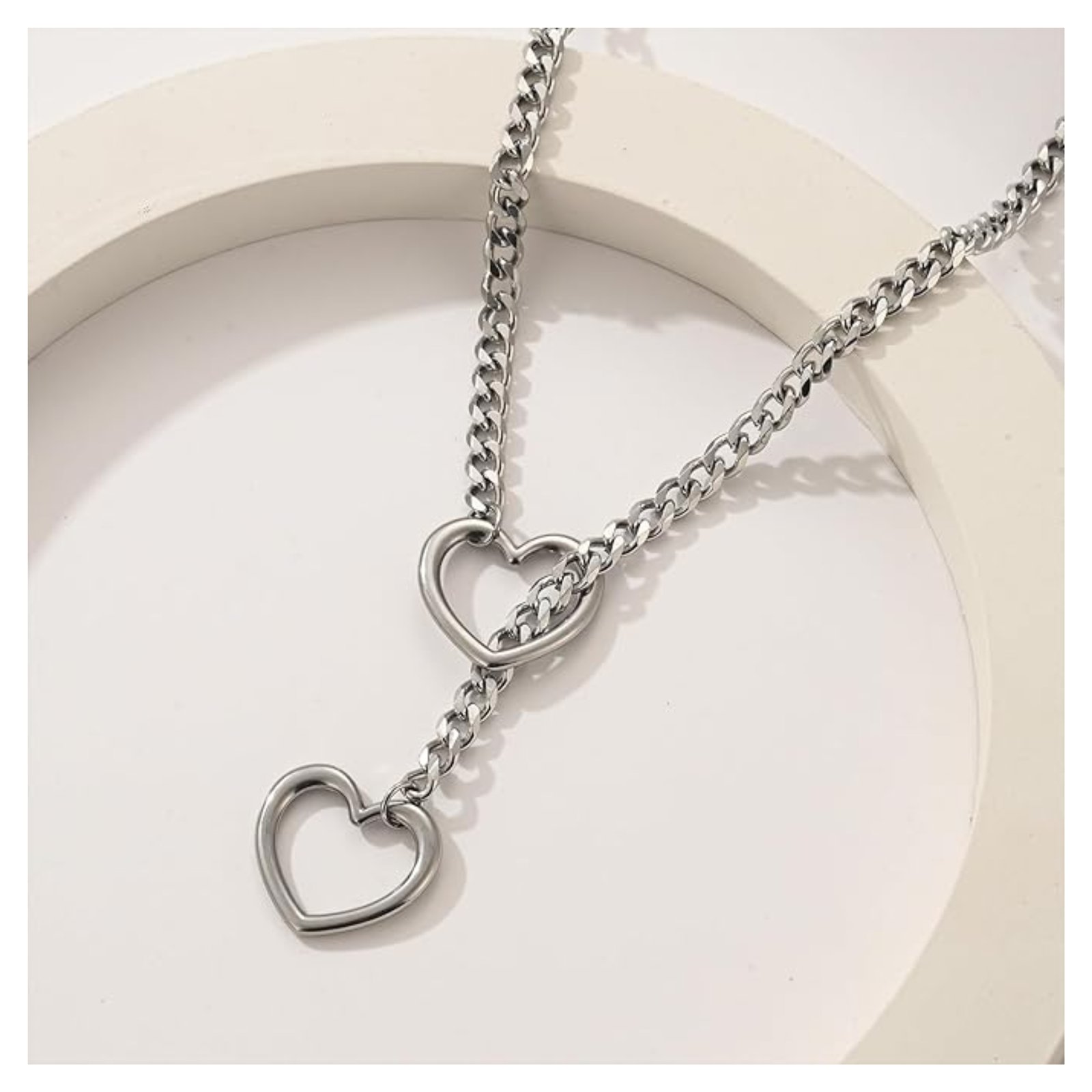 Este collar de cadena plateada con corazones es ideal si buscas algo bonito, combinable y fácil de usar todos los días. La cadena tiene un sistema deslizante, así que puedes ajustarlo a la altura que más te guste: más pegado al cuello o un poco más largo según tu outfit.
