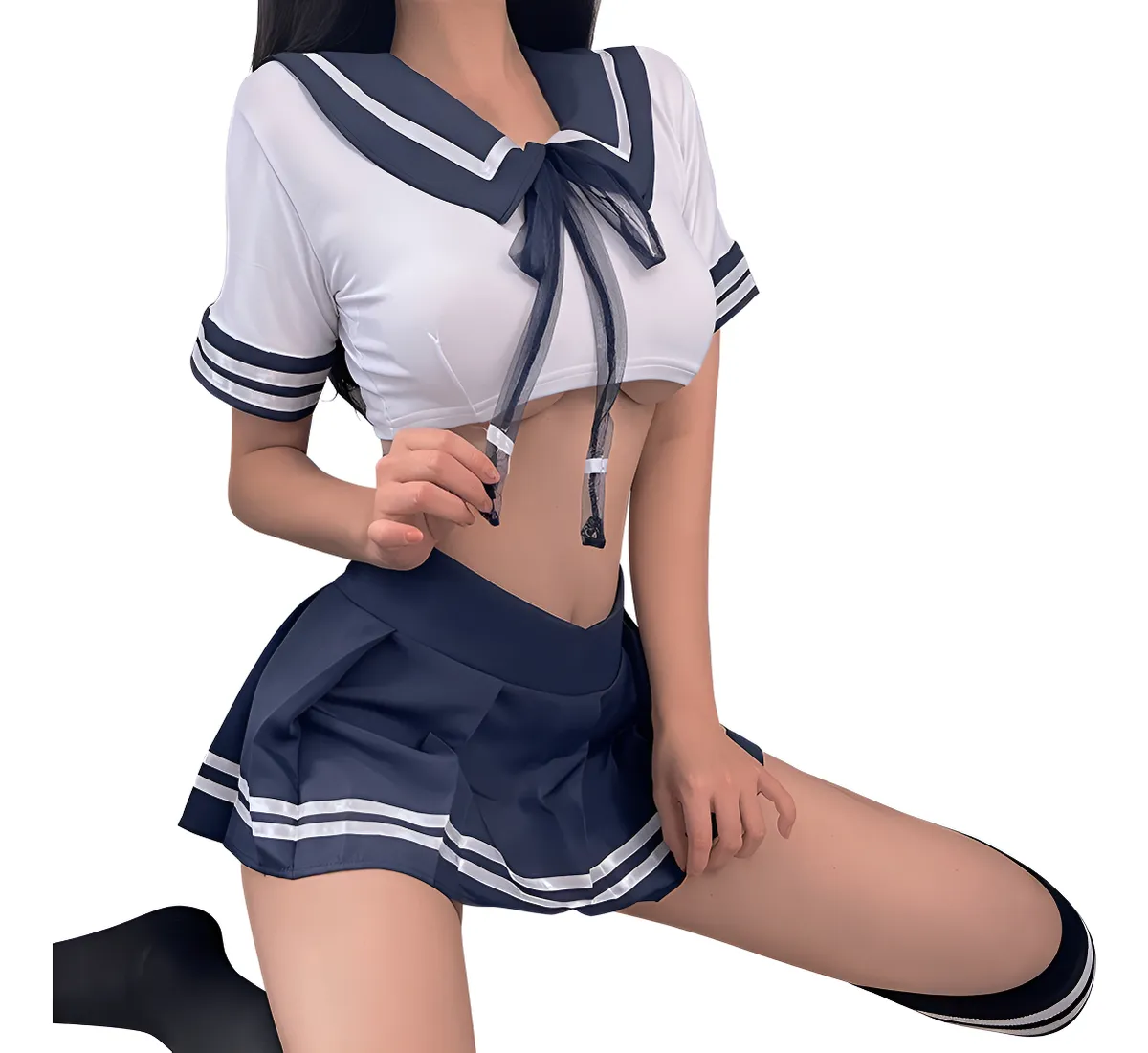 Las mangas cortas adornadas con líneas blancas completan ese toque icónico del seifuku, mientras que la minifalda plisada, corta y juguetona, se mueve contigo en cada paso, revelando justo lo necesario para encender la imaginación. Azul marino profundo, franjas blancas y una silueta que promete travesuras… un clásico, reinventado para el placer.