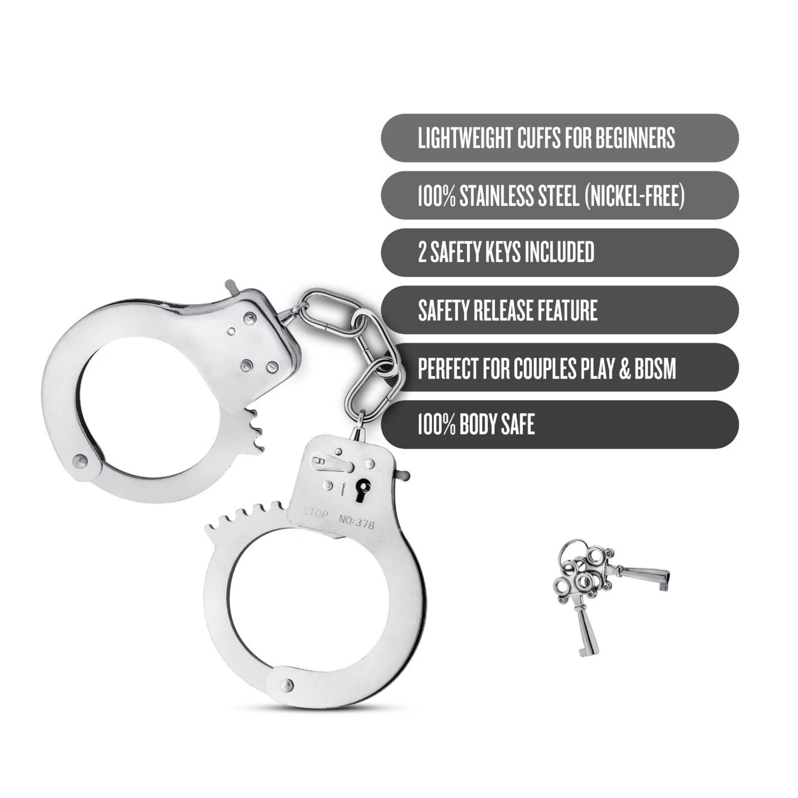 Esposas ligeras de acero inoxidable, ajustables, con liberación rápida y 2 llaves incluidas. Seguras, elegantes y perfectas para parejas que desean experimentar bondage suave.