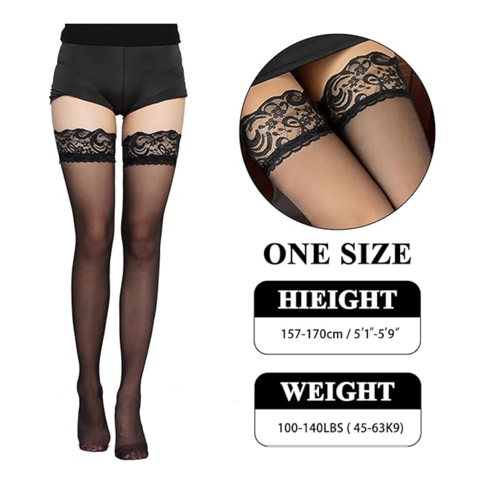 Medias negras delgadas con encaje en la parte superior, sin silicón y de estilo económico. Ideales para usar con liguero y darle un toque sensual a tu lencería.